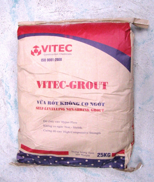 - VITEC GROUT là vữa tự chảy không co ngót, tính năng cao, thời gian cho phép thi công lâu, được dùng để sửa chữa các cấu kiện bê tông bị rỗng, rỗ, hỏng, lấp kín các khe hở trong cấu kiện bê tông đúc sẵn, đổ vữa bệ gối cầu, móng máy, chân cột, neo ống cáp, định vị các bu lông và tất cả những nơi yêu cầu loại vữa không co ngót.